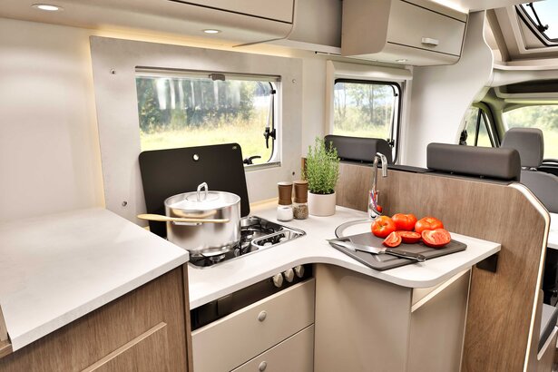 Hjørnekjøkkenet byr ikke bare på intelligent plassutnyttelse, men også matlagingskomfort på høyeste nivå. Med komfyren med to brennere blir dine kulinariske kreasjoner garantert uforglemmelige. Glasset og vaskelokket skaper ekstra arbeidsplass.
