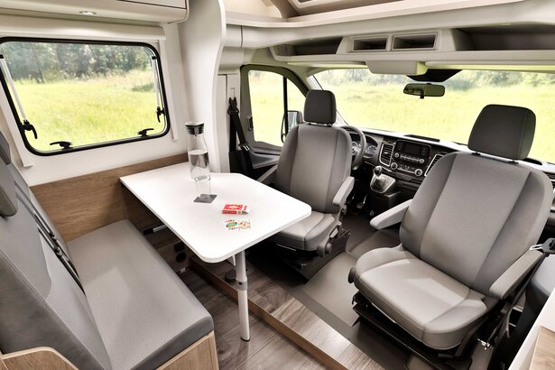 Ved å snu fører- og passasjersetene kan bodelen på et øyeblikk forvandles til en innbydende sittegruppe med et funksjonelt bord. Ingenting står i veien for en koselig spillkveld.