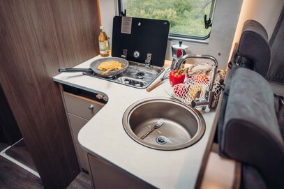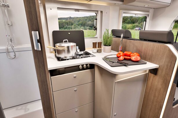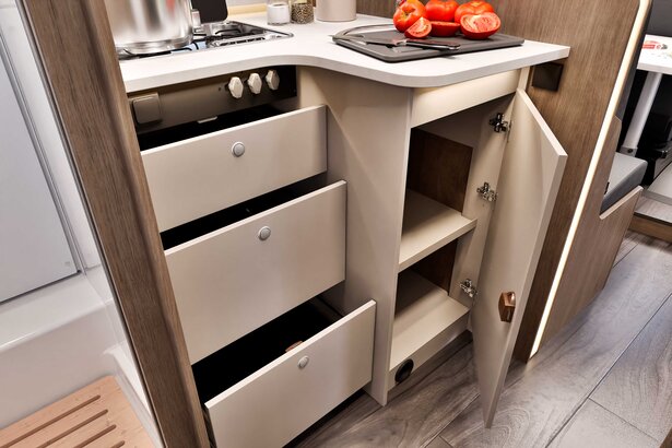 I T449 er det en fornøyelse å lage mat mens du er på farten. Det romslige og velutstyrte L-formede kjøkkenet lar ingenting tilbake å ønske. Her finner du alt du trenger for å tilberede deilige måltider, kompakt og praktisk organisert