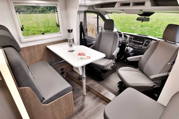Spisestue på hjul. Sittegruppen med benk på motsatt side gir rikelig med plass til familie og venner.