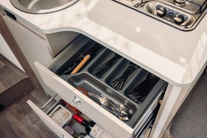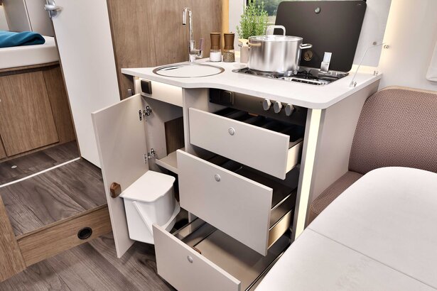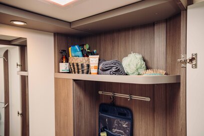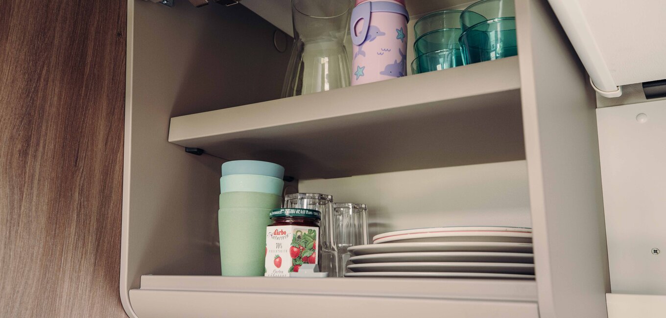 T459 kjennetegnes av sin fleksible oppbevaringsløsning som gir plass til en rekke gjenstander. Den romslige bakre garasjen, store skuffer og praktiske overskap lar deg tilpasse oppbevaringsplassen etter dine behov.