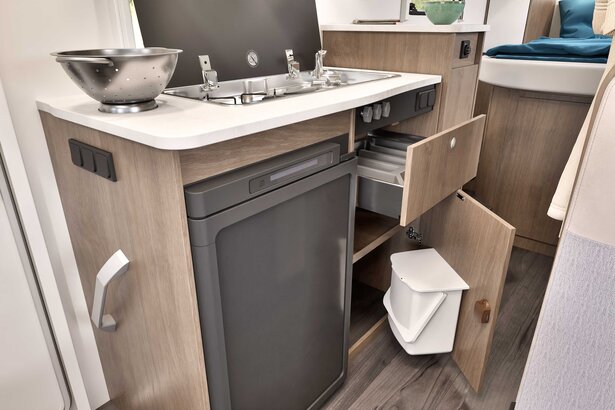 De mange overskapene og et ekstra skap under sengen sørger for at det er plass til alle dine favoritting. I tillegg er det flere skap og praktiske oppbevaringsområder i førerhuset.